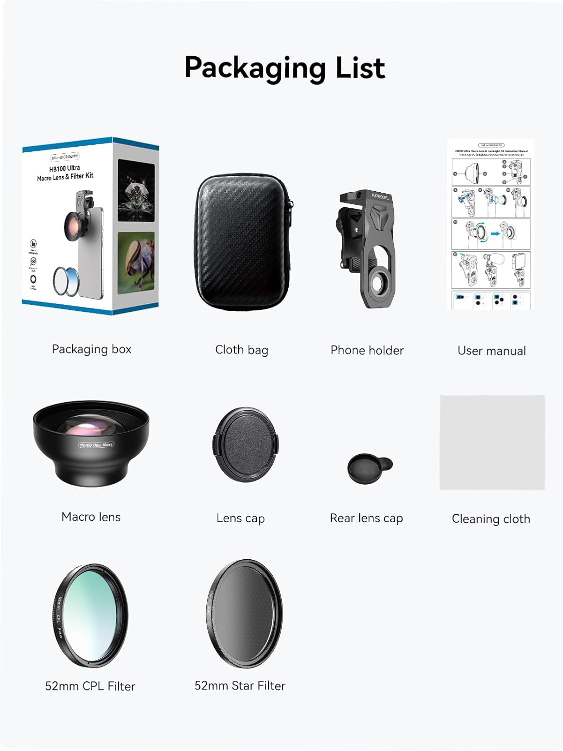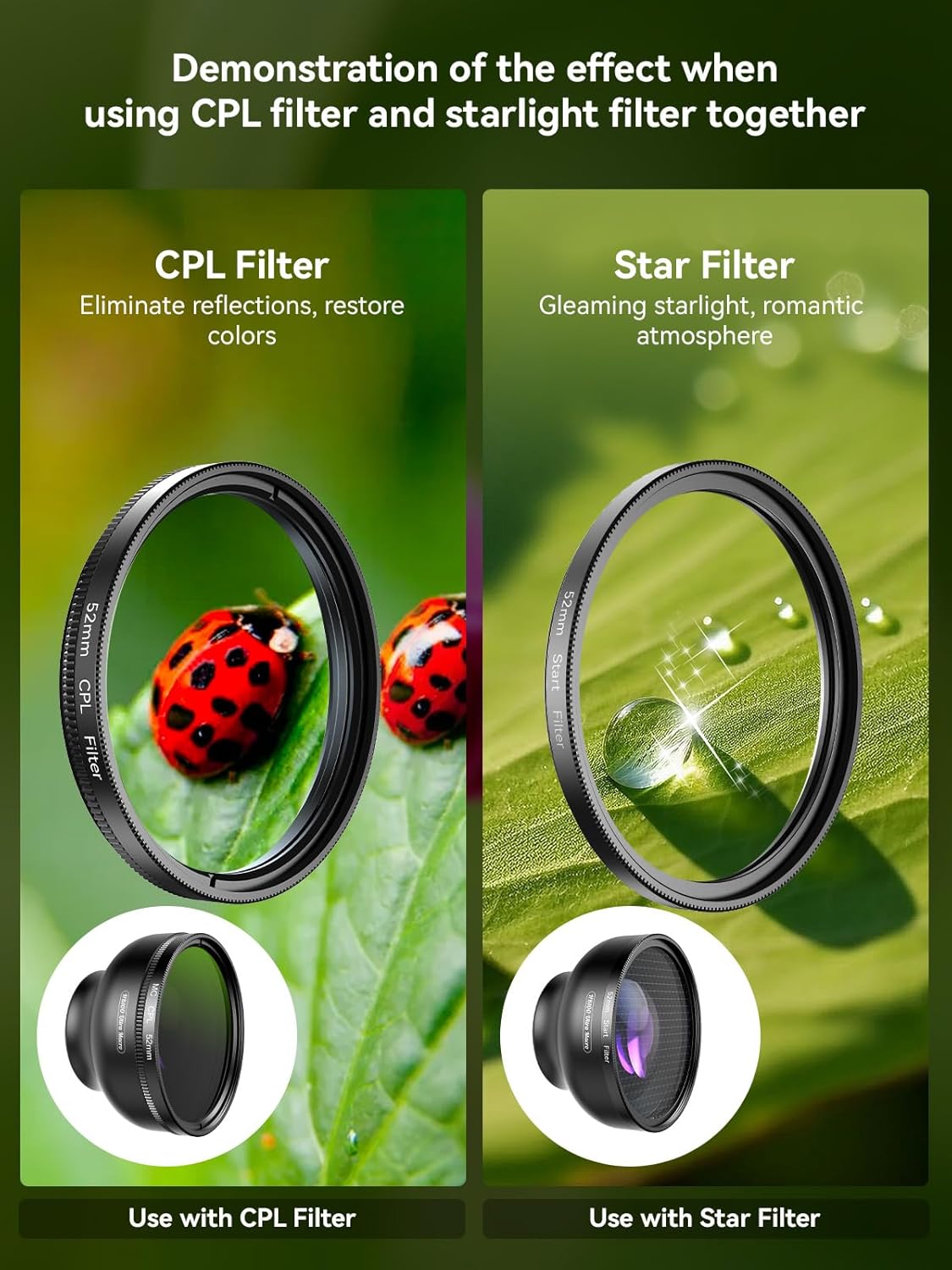 - 52mm Filter: MIAO LAB offers two specialized filters for its macro lens: a CPL filter (eliminates reflections and glare) and a star filter (transforms light sources into dazzling star-like points). Combine both filters to create uniquely artistic macro shots and dramatically enhance your images.